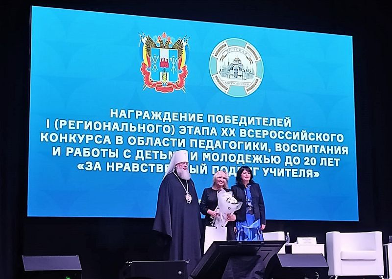 В рамках пленарного заседания во время церемонии награждения победителей I (регионального) этапа Всероссийского конкурса в области педагогики, воспитания и работы с детьми и молодежью за 20 лет «За нравственный подвиг учителя» дипломом в номинации «За организацию духовно-нравственного воспитания в образовательной организации» награждена Козаченко Валентина Ивановна, учитель МБОУ Куйбышевской СОШ им. А.А. Гречко.