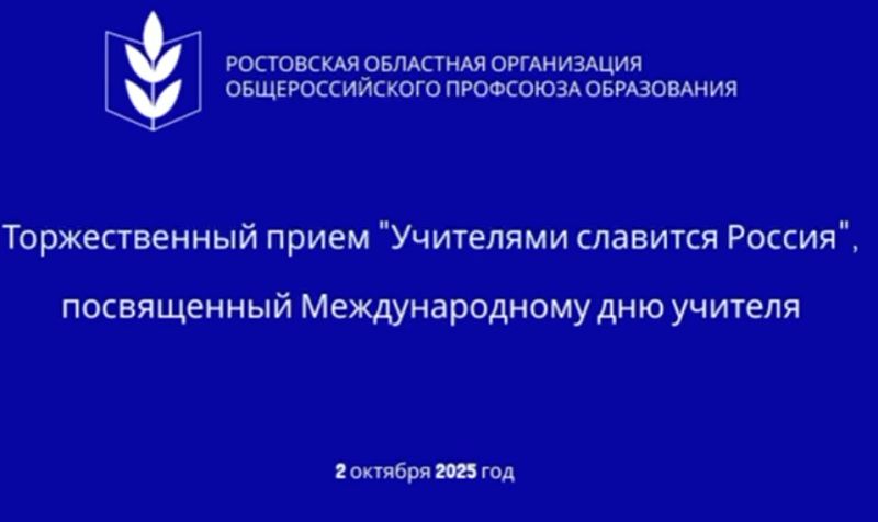 2 октября 2025 года в здании Ростовского государственного музыкального театра прошел торжественный приём «Учителями славится Россия», посвященный Международному Дню Учителя.В торжестве приняли участие победители профессиональных конкурсов разных лет, ветераны педагогического труда, лучшие педагогические работники образовательных организаций Ростовской области, председатели территориальных организаций Профсоюза и работники аппарата областной организации Профсоюза.